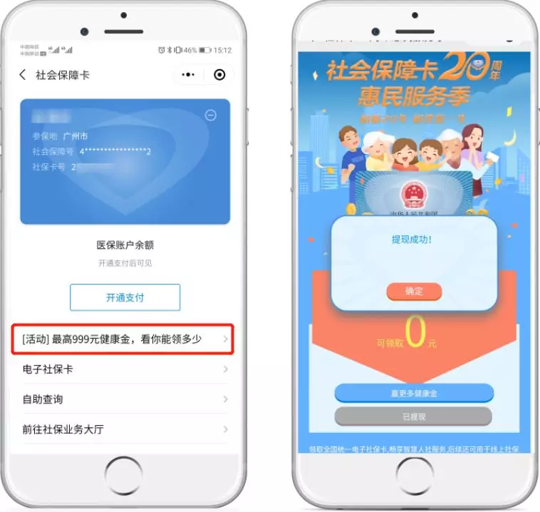 綁定電子社保卡后,可通過社保卡詳情頁,回到活動首頁,點擊“提現到零錢”,馬上提現。