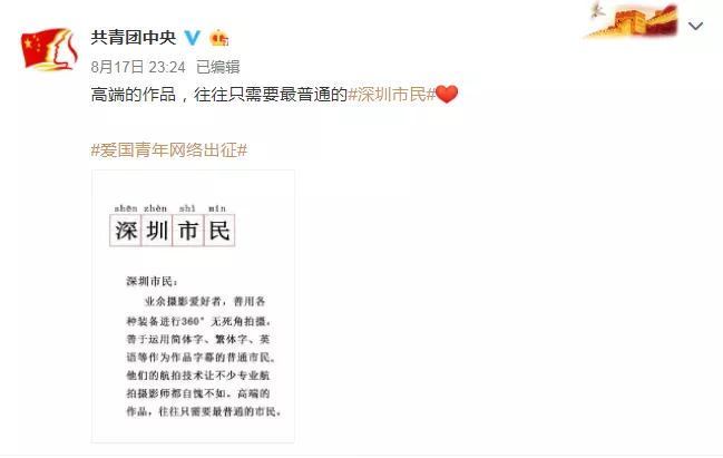 就連共青團中央都點名表揚:“高端的作品,往往只需要最普通的#深圳市民#”