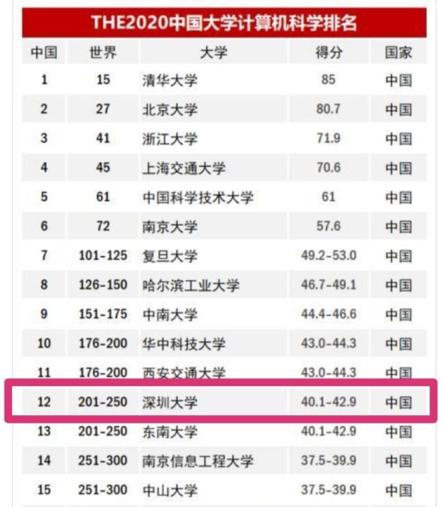 9月份,泰晤士高等教育公布了2020世界大學(xué)排名,近日又對(duì)計(jì)算機(jī)科學(xué)專業(yè)等數(shù)個(gè)熱門學(xué)科進(jìn)行排名更新。今年參與泰晤士計(jì)算機(jī)科學(xué)排名的大學(xué)從去年的684所擴(kuò)大到749所,最新排名顯示,中國(guó)內(nèi)地有6所大學(xué)的計(jì)算機(jī)科學(xué)專業(yè)進(jìn)入世界百?gòu)?qiáng)。深圳大學(xué)在中國(guó)內(nèi)地大學(xué)計(jì)算機(jī)科學(xué)專業(yè)中位列第12,較上一年度提升了1位,去年世界排名位于301-400之間,今年進(jìn)階至201-250位之間。