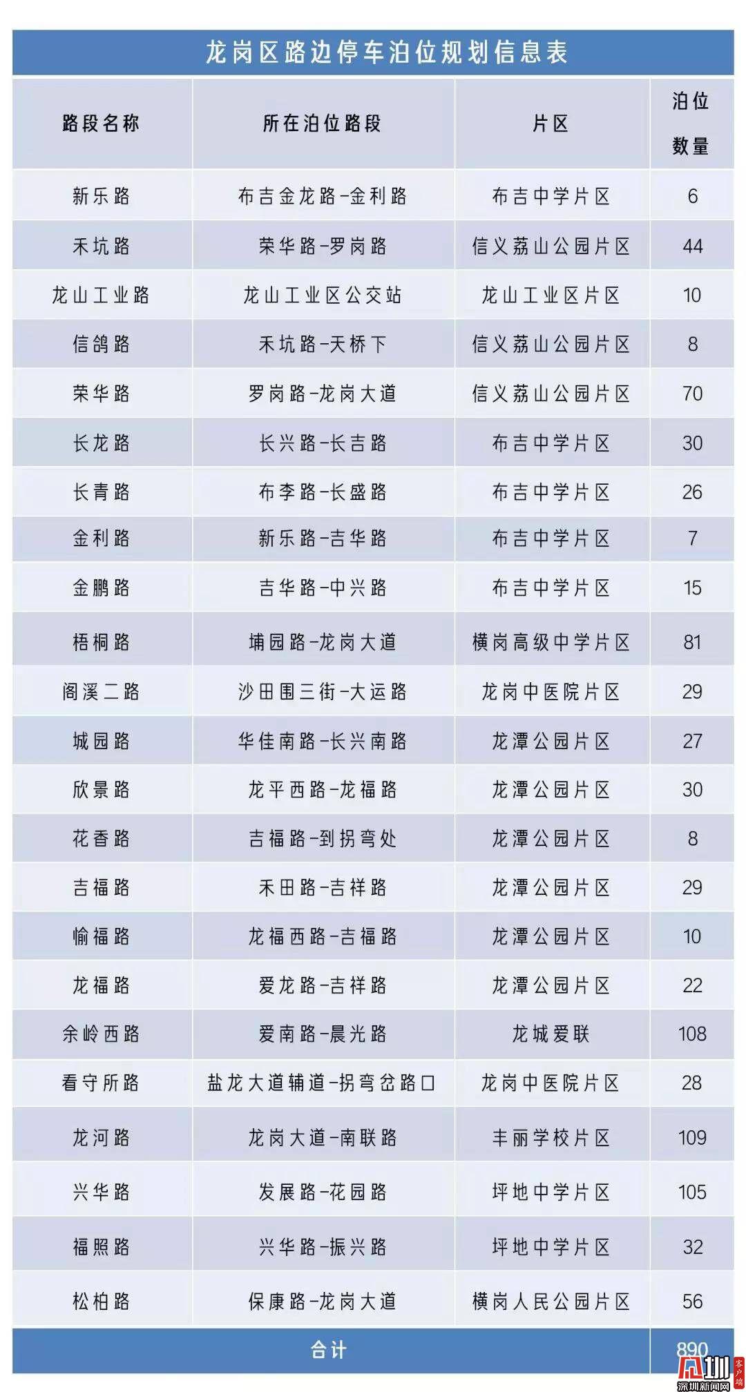 龍崗區(qū)路邊宜停車位規(guī)劃信息表。