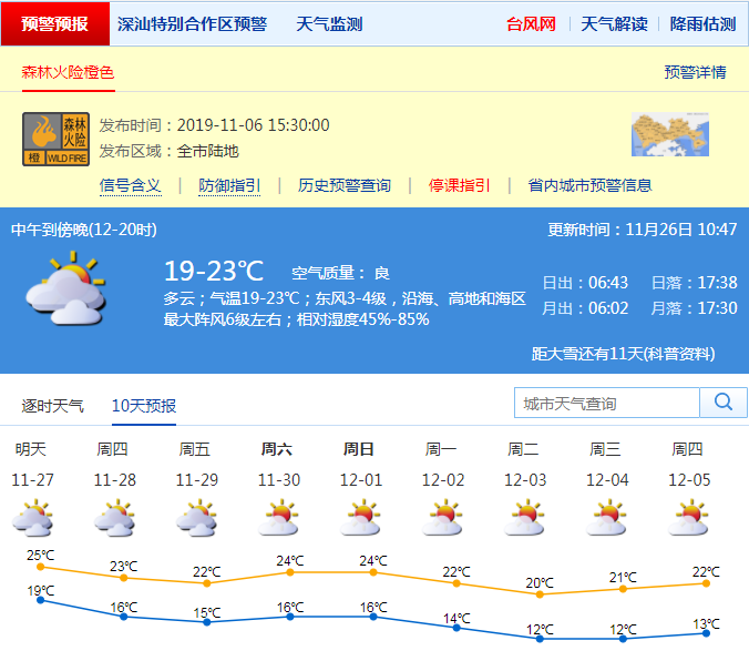 見圳客戶端·深圳新聞網(wǎng)2019年11月26日訊 記者從市氣象臺(tái)獲悉,26日多云,氣溫19-23℃;27日晴間多云,空氣干燥,早晚清涼,夜間新一股空氣開始影響我市。