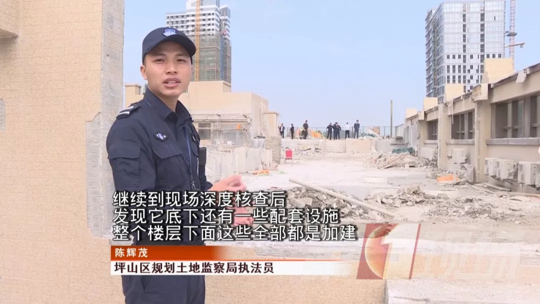 原本應該是水泥平臺的樓頂,現(xiàn)在卻顯示為藍色花紋影像,發(fā)現(xiàn)這個情況后,坪山區(qū)規(guī)劃土地監(jiān)察局立即組織工作人員進行核查。結果發(fā)現(xiàn),是在樓房經過規(guī)劃驗收后,開發(fā)商偷偷建設了一處游泳池。