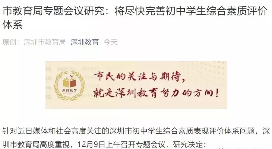 針對(duì)近日社會(huì)高度關(guān)注的深圳市初中學(xué)生綜合素質(zhì)表現(xiàn)評(píng)價(jià)體系問(wèn)題,深圳市教育局于今天上午召開專題會(huì)議,并作出最新回應(yīng):將盡快完善初中學(xué)生綜合素質(zhì)評(píng)價(jià)體系。