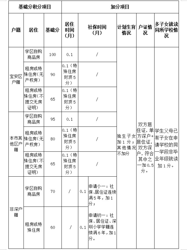 (1)其中申請(qǐng)小一的,父母一方持有深圳居住證、累計(jì)繳納社保(養(yǎng)老保險(xiǎn)和醫(yī)療保險(xiǎn)同時(shí)繳納)年限滿5年及以上的非深戶籍人員子女,加1分。