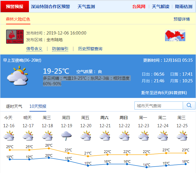 見圳客戶端·深圳新聞網(wǎng)2019年12月16日訊 今日深圳多云間晴;氣溫19-25℃;東風(fēng)2-3級;相對濕度60%-90%