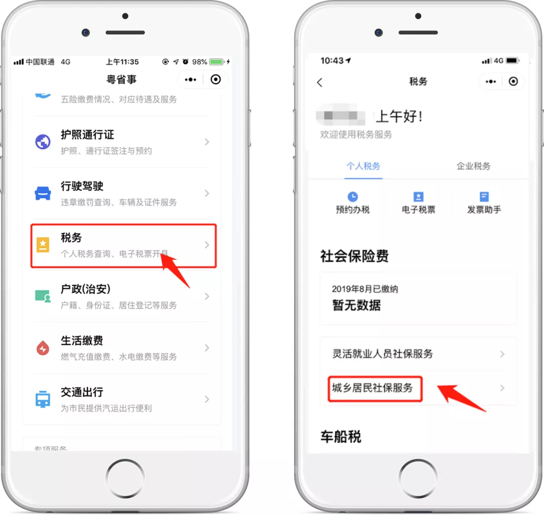 在“粵省事”小程序首頁點擊“稅務”服務,在“個人稅務”板塊找到“社會保險費”—“城鄉(xiāng)居民社保服務”(暫不支持深圳地區(qū))。
