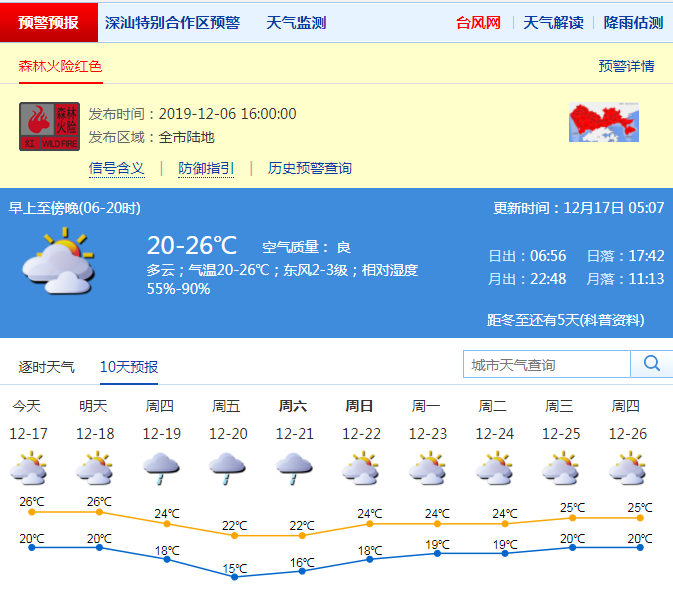 深圳市氣象局預(yù)計(jì)17-18日多云,早晚有輕霧,天氣溫暖;19-21日受冷空氣影響,陰天間多云,有分散小雨,氣溫下降,天氣明顯轉(zhuǎn)涼。22日多云,氣溫回升。