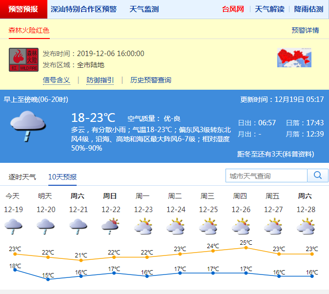 見圳客戶端·深圳新聞網(wǎng)2019年12月19日訊 深圳市氣象局預計18日夜間至21日冷空氣影響,轉(zhuǎn)陰天,有分散小雨,沿海、高地和海區(qū)陣風6-7級,氣溫下降,20日最低氣溫15℃;22日午后轉(zhuǎn)多云,23-25日可見陽光,氣溫回升。