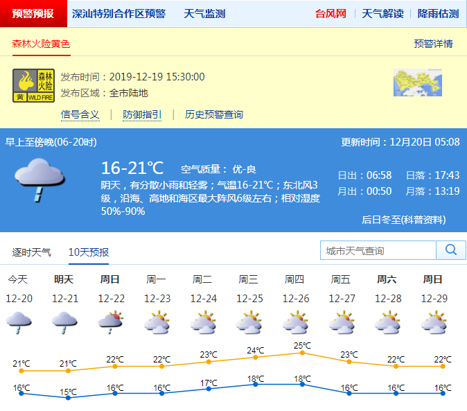 見圳客戶端·深圳新聞網(wǎng)2019年12月20日訊 從18日夜間到19日下午,我市陰天,早晚有輕霧和分散小雨,白天最高氣溫介于20-23℃之間。森林火險(xiǎn)紅色預(yù)警信號(hào)已降級(jí)為黃色。