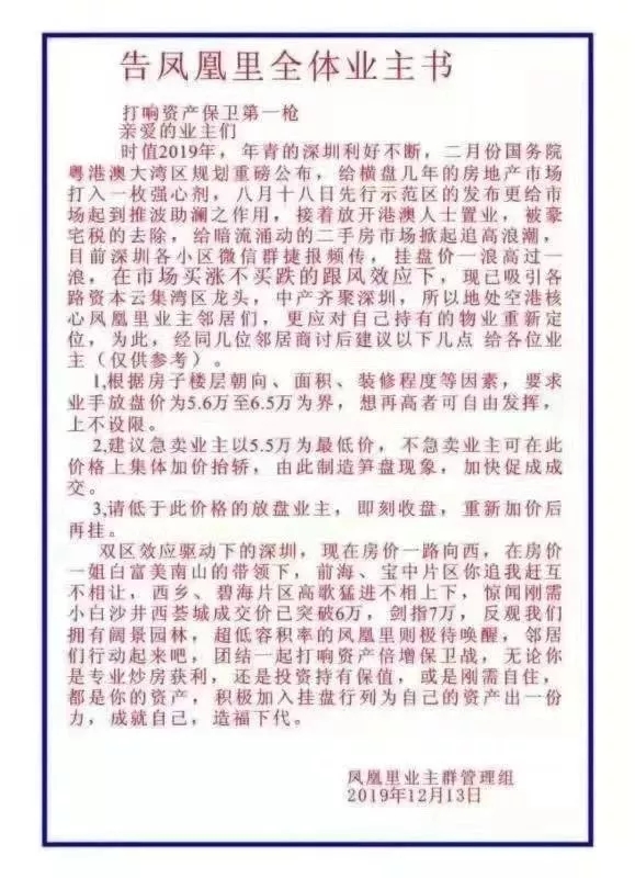 近日,福海街道中糧鳳凰里花苑小區(qū)個別業(yè)主發(fā)布集體漲價言論,涉嫌惡意炒作二手房價,以下為網傳業(yè)主倡議書