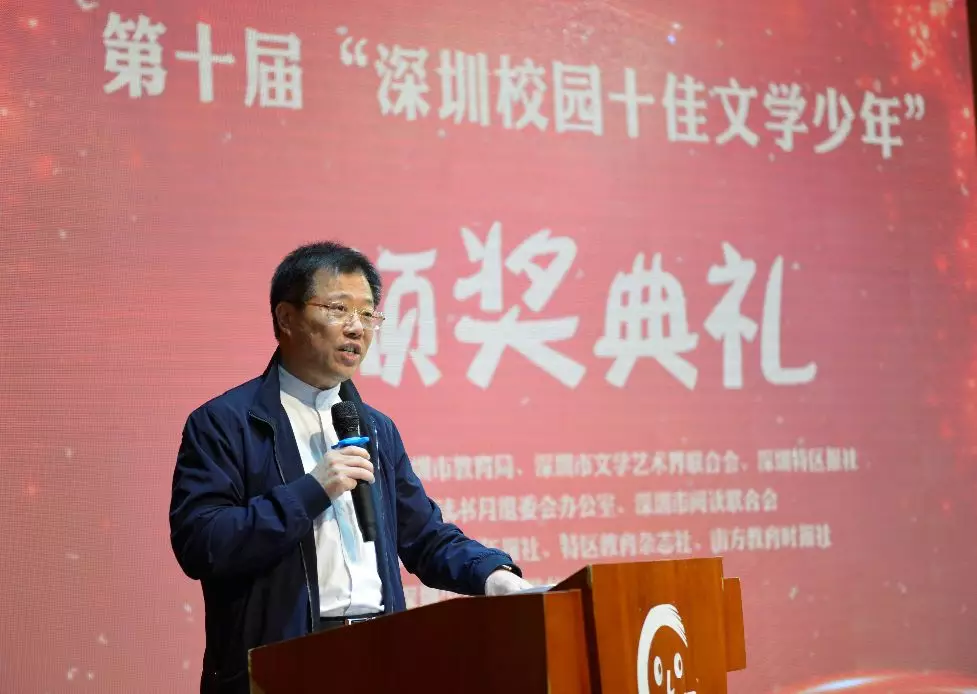 市教育局副局長(zhǎng)王水發(fā)代表深圳市教育局向獲獎(jiǎng)的同學(xué)表示熱烈祝賀。他說,為了培育社會(huì)核心價(jià)值、傳承民族文化基因、培養(yǎng)文化創(chuàng)意人才,深圳校園文學(xué)開辟了一條新的路徑,對(duì)深圳建設(shè)城市文明典范起到了奠基、培根和固本的重要作用。