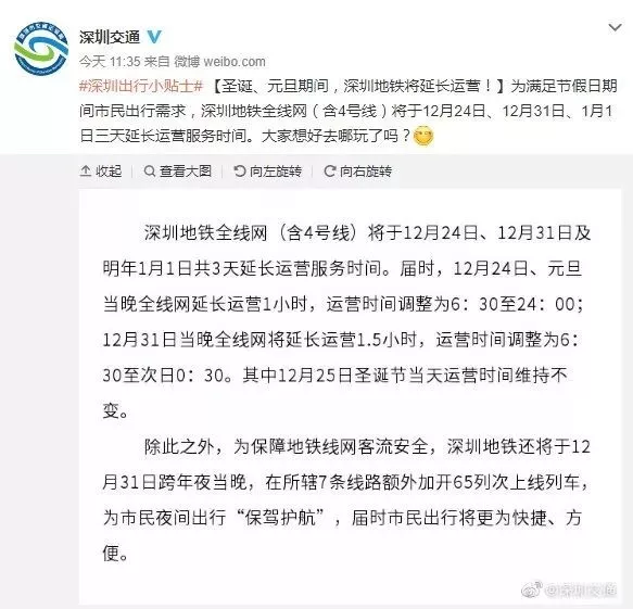 這里還要給大家插播一條交通消息。小編掐指一算,2019年馬上就要結(jié)束了,各位小伙伴是不是都開始,為新年假期做準(zhǔn)備了呢?這么重要的出去浪的機(jī)會(huì),怎能為趕不上末班地鐵煩惱?不要緊,地鐵也延長(zhǎng)運(yùn)營(yíng)時(shí)間啦。