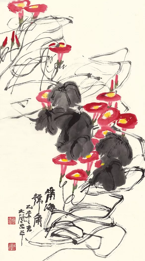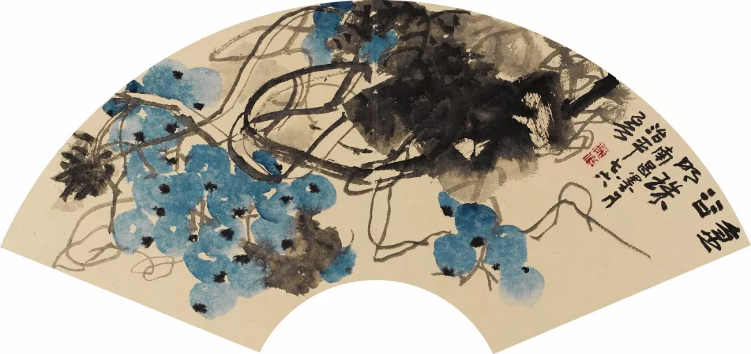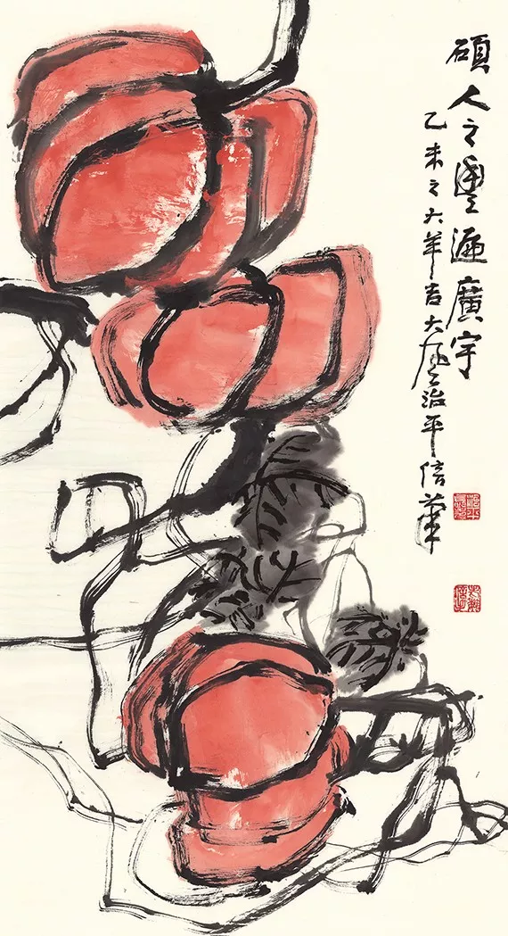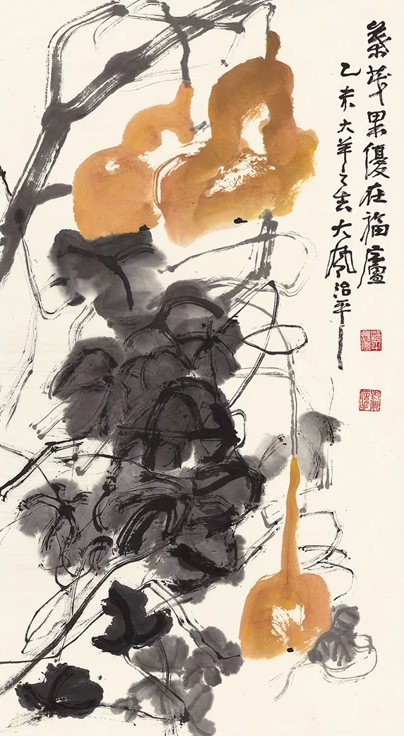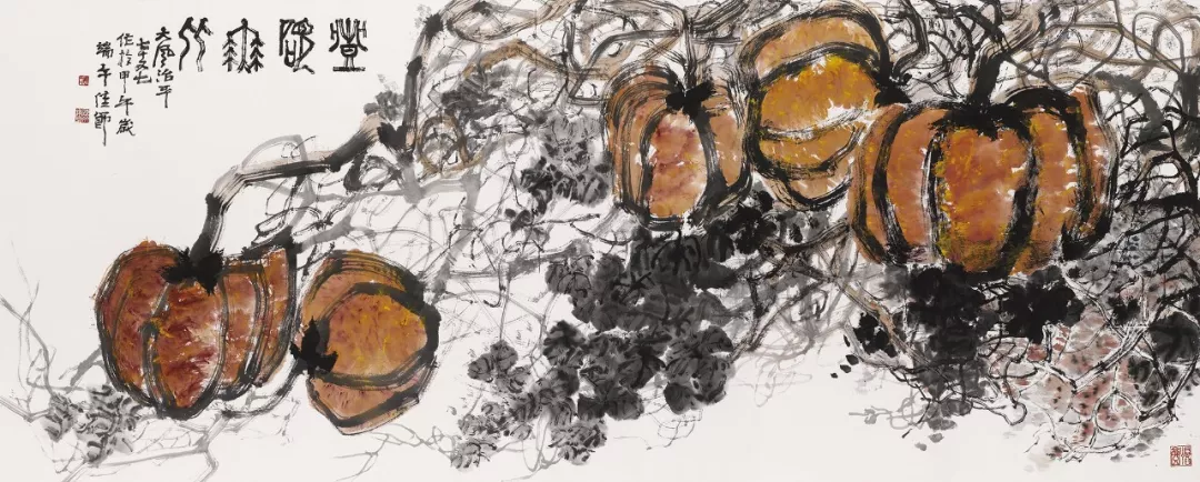 魏治平的畫,尤以藤類見長,構圖奇異,筆酣墨飽,瓜果菜蔬鳥蟲魚,無一不獨出心裁,氣象崢嶸,水墨淋漓之間極富創(chuàng)作精神,他筆下的南瓜、紫藤、凌霄、葡萄等更有齊白石、吳昌碩之風,自成一派,奔放不離法度,神微孕育氣魄。