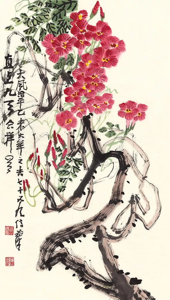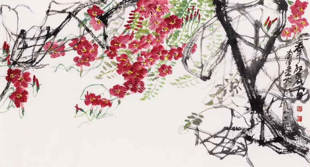 記者在魏治平的工作室看到,他創(chuàng)作的凌霄每一幅都有所不同,不僅畫出了凌霄花的千姿百態(tài),還呈現(xiàn)了凌霄根、藤、葉的獨特風姿。葉茂花紅、根老彌壯、藤連天下,每一幅凌霄都代表了魏治平作為藝術家對國家的美好祝福。在此次展覽上,觀眾也能看到魏治平最新創(chuàng)作的凌霄。