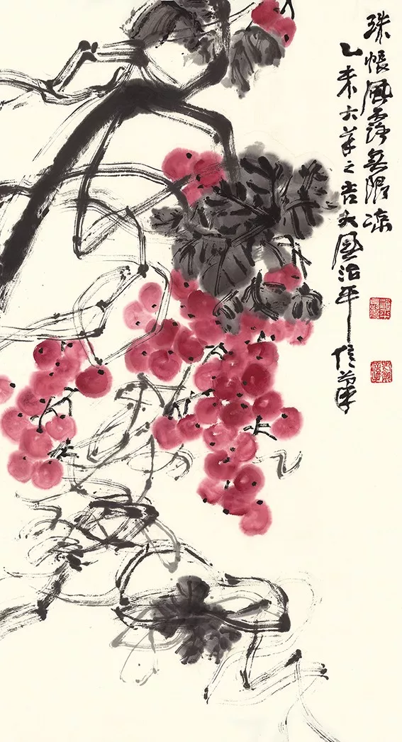 魏治平先生的畫,尤以藤類見長,構圖奇異,筆酣墨飽;他最為推崇齊白石,繪畫技法亦師法齊白石、吳昌碩、端木夢錫等人,瓜果菜蔬鳥蟲魚,無一不獨出心裁,氣象崢嶸,水墨淋漓之間極富創(chuàng)作精神,他筆下的南瓜、紫藤、凌霄、葡萄等更有齊白石、吳昌碩之風,自成一派,奔放不離法度,神微孕育氣魄。