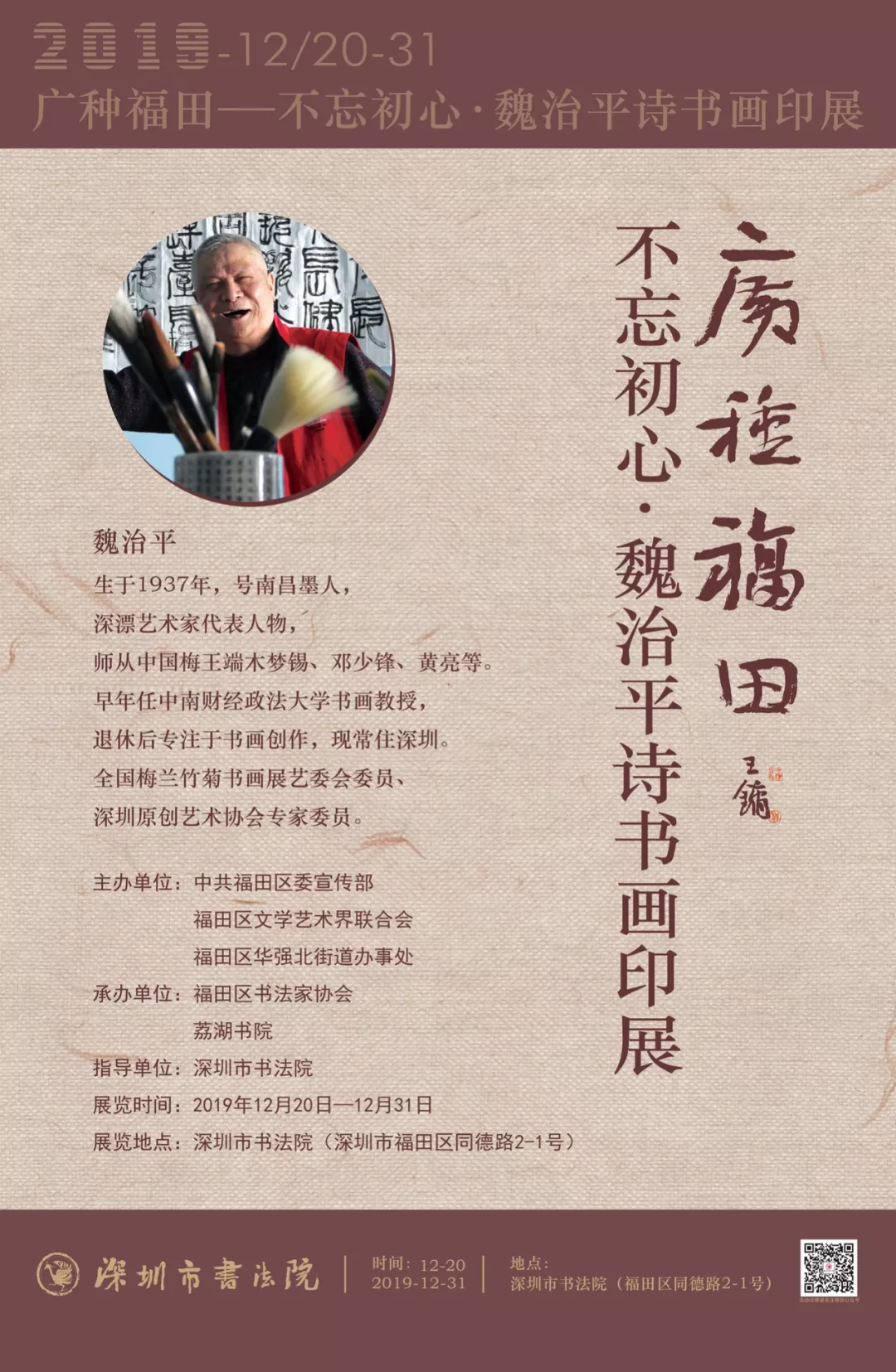 12月20日至12月31日,“廣種福田不忘初心——魏治平詩書畫印展”在深圳市書法院展出。年過八十的魏治平,仍筆耕不輟,堅持攀登藝術高峰,不斷創(chuàng)作。本次展覽除了展出他多年創(chuàng)作的詩書畫印精品,還會展出他今年的最近佳作。