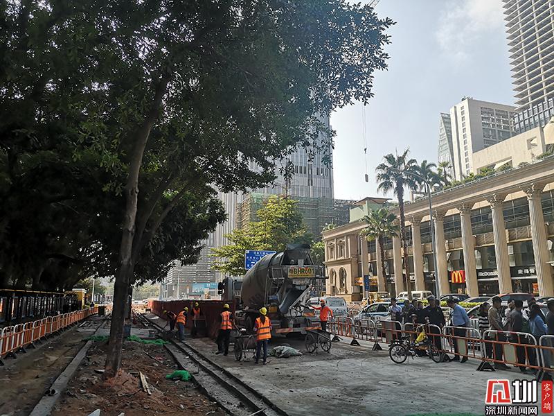 福田區(qū)福中三路和民田路的施工現(xiàn)場,道路被挖,一輛挖掘機(jī)停在道路上。