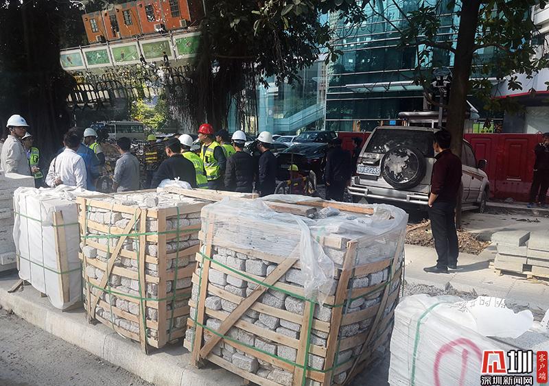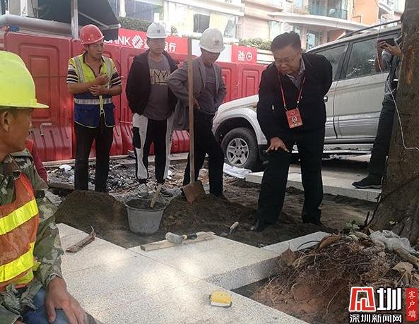 上午10點(diǎn),深圳市交通運(yùn)輸局執(zhí)法人員來到福田區(qū)民田路與福華路路口的一處施工現(xiàn)場。記者在現(xiàn)場看到,沿著福華路一側(cè)的人行道基本全部被挖開,建筑工人正在進(jìn)行人行道石磚的鋪設(shè)工作,由于施工圍擋布置不規(guī)范,現(xiàn)場也沒有完善的路線指引,不少市民出行受阻。