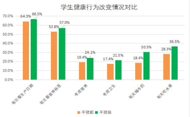 通過(guò)1學(xué)年的營(yíng)養(yǎng)教育活動(dòng),評(píng)估發(fā)現(xiàn),學(xué)生選擇經(jīng)常吃的零食中,水果類排名第一,占69.6%;糖果類由26.6%明顯下降至19.9%,降幅25%。經(jīng)常喝的飲料依次是白開水、純牛奶酸奶、果汁和碳酸飲料,干預(yù)后白開水和牛奶比例分別提升至83.4%和76.7%,升幅均超過(guò)10%;果汁和碳酸飲料分別降低至38.9%和17.3%,尤其是碳酸飲料降幅超過(guò)了30%。每天喝牛奶的比例明顯提升至30.5%,升幅65.8%;每天吃水果的比例提升至36.5%,升幅達(dá)到36.5%。每天吃早餐的比例由67.8%上升至74%。