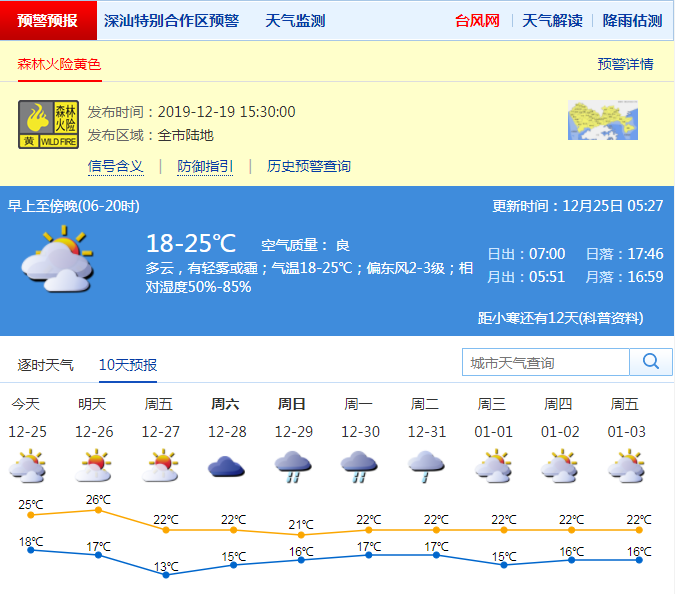 見圳客戶端·深圳新聞網(wǎng)2019年12月25日訊 25-26日多云間晴天,有輕霧或霾;26日夜間至27日冷空氣影響,風力加大,沿海、高地和海區(qū)最大陣風7級左右,氣溫下降,天氣轉涼,最低氣溫14℃;28日夜間-31日轉陰雨天氣。