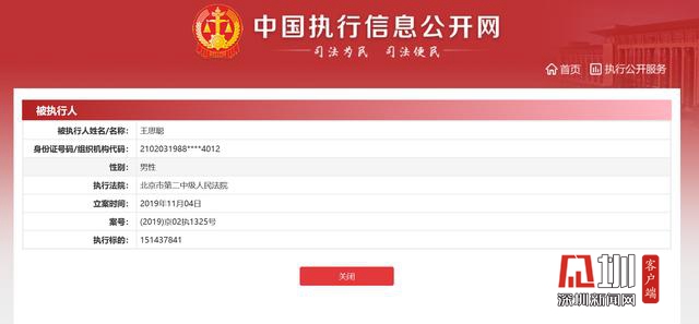 中國(guó)執(zhí)行信息公開網(wǎng)上發(fā)布的被執(zhí)行人王思聰信息頁(yè)面截圖。