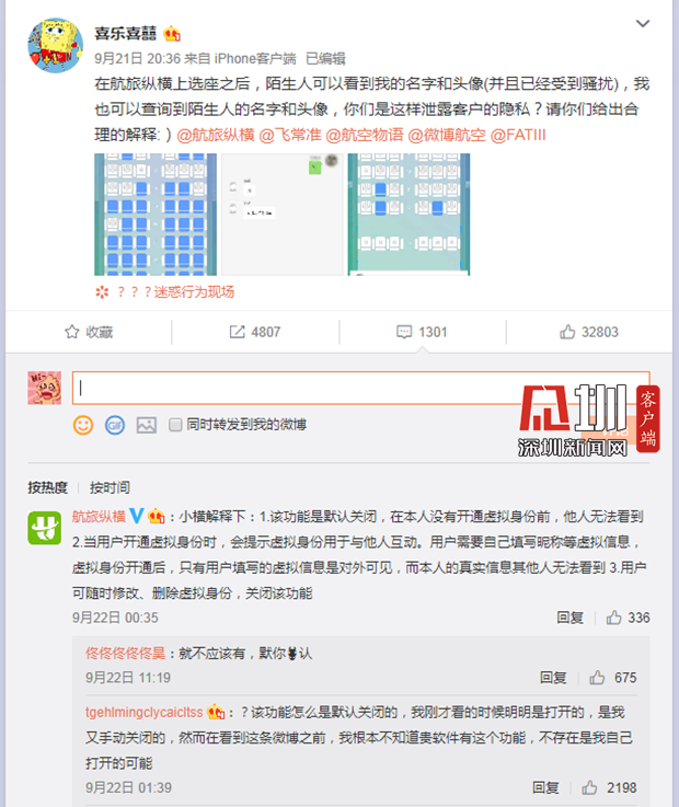 微博網(wǎng)友@喜樂(lè)喜囍最早爆出航旅縱橫App默認(rèn)開啟陌生人社交功能,圖為頁(yè)面截圖。