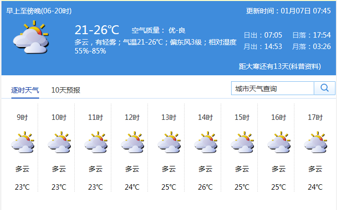 (二)春節(jié)期間(1月24-30日):我市天氣總體平穩(wěn),強(qiáng)冷空氣影響可能性小。氣溫略偏高,平均氣溫19-20 ℃,較近5年平均氣溫(19.1 ℃)略偏高,最低氣溫13-15 ℃,期間可能有2-3天雨霧天氣。