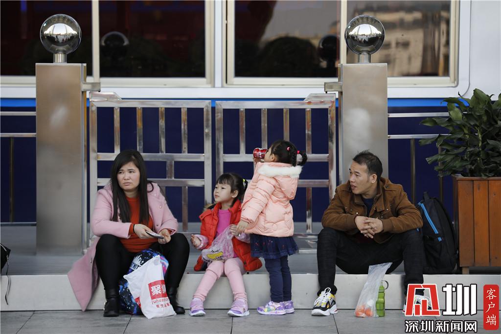 深圳北站東廣場(chǎng),兩個(gè)小女孩正和家人等車。
