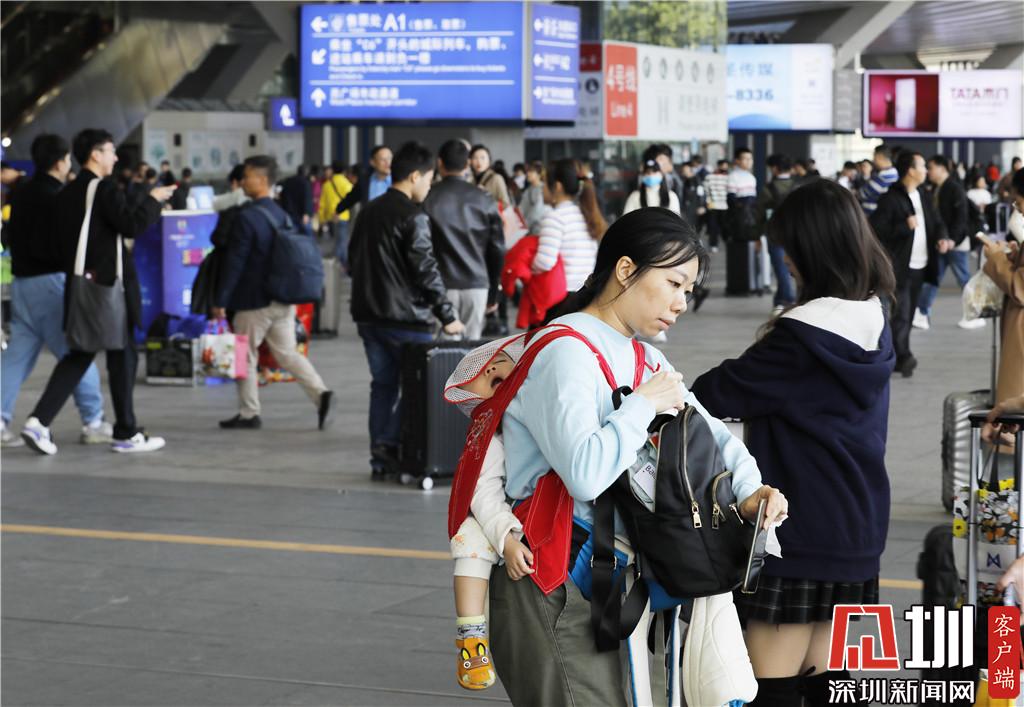 深圳北站東廣場(chǎng)入站口,一位家長背著一位熟睡的孩子。