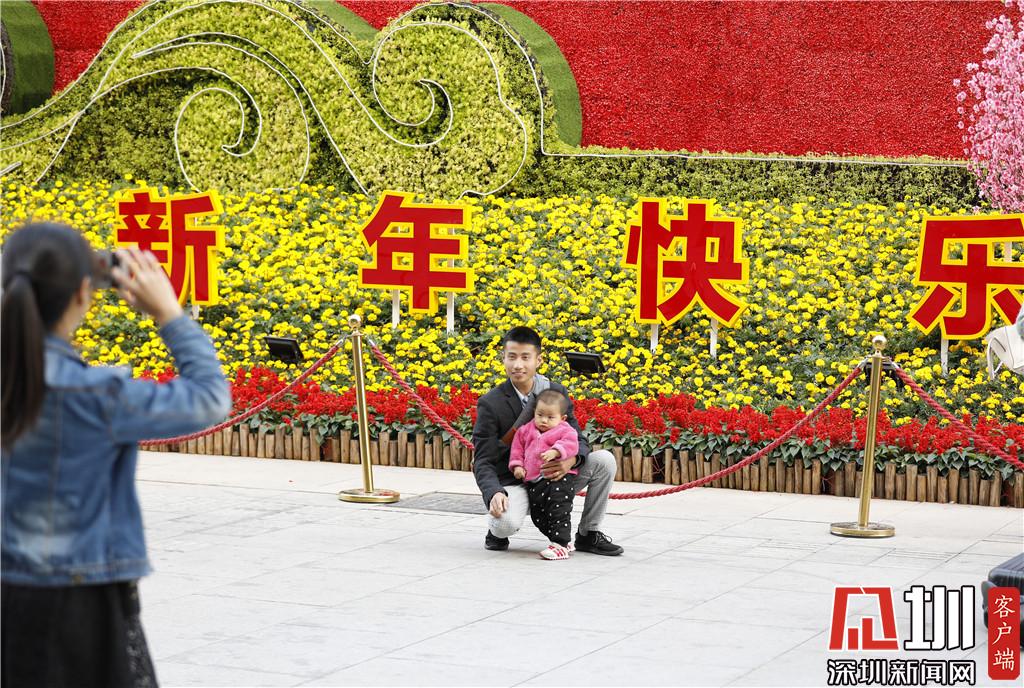 深圳北站東廣場(chǎng),一位家長和孩子在“新年快樂”的牌子前合影留念。