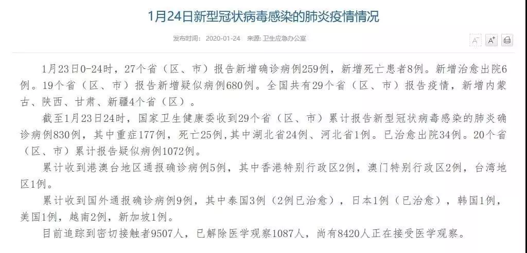 國(guó)家衛(wèi)建委通報(bào):1月23日0-24時(shí),27個(gè)?。▍^(qū)、市)報(bào)告新增確診病例259例,新增死亡患者8例。新增治愈出院6例。19個(gè)?。▍^(qū)、市)報(bào)告新增疑似病例680例。全國(guó)共有29個(gè)?。▍^(qū)、市)報(bào)告疫情,新增內(nèi)蒙古、陜西、甘肅、新疆4個(gè)?。▍^(qū))。