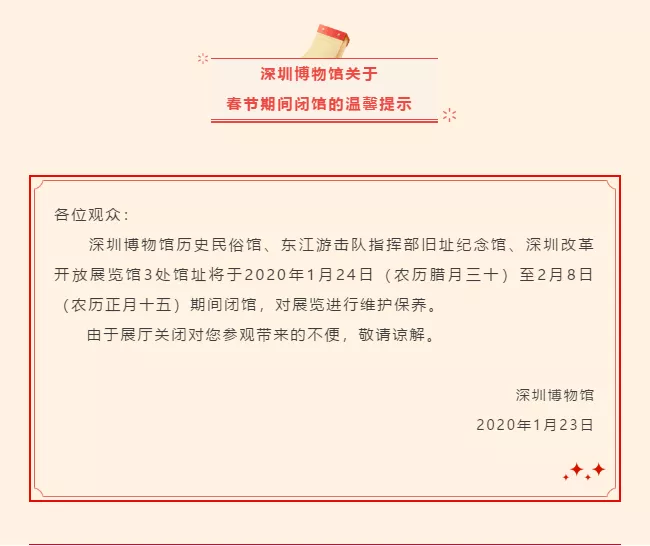 深圳博物館歷史民俗館、東江游擊隊(duì)指揮部舊址紀(jì)念館、深圳改革開放展覽館3處館址將于2020年1月24日(農(nóng)歷臘月三十)至2月8日(農(nóng)歷正月十五)期間閉館,對(duì)展覽進(jìn)行維護(hù)保養(yǎng)。由于展廳關(guān)閉對(duì)您參觀帶來(lái)的不便,敬請(qǐng)諒解。