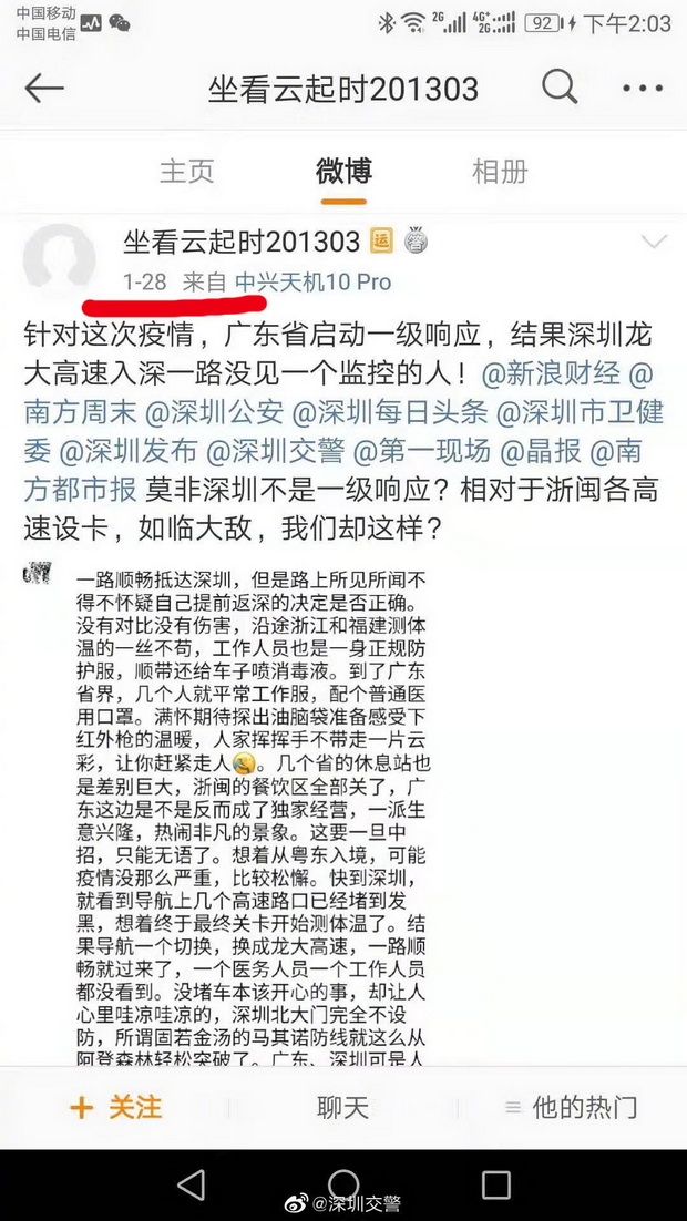 1月28日,有網(wǎng)友在社交軟件上稱深圳“不設(shè)防”,龍大高速無檢疫點(diǎn)。