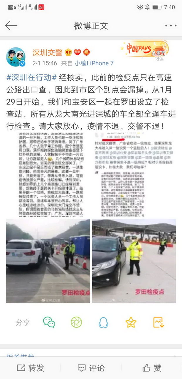 2月1日下午,深圳交警在其官方微博上表示,經(jīng)核實(shí),此前的檢疫點(diǎn)只在高速公路出口查,因此到市區(qū)個(gè)別點(diǎn)會(huì)漏掉。從1月29日開始,深圳交警和寶安區(qū)一起在羅田設(shè)立了檢查站,所有從龍大南光進(jìn)深城的車全部全逢車進(jìn)行檢查。請(qǐng)大家放心,疫情不退,交警不退。