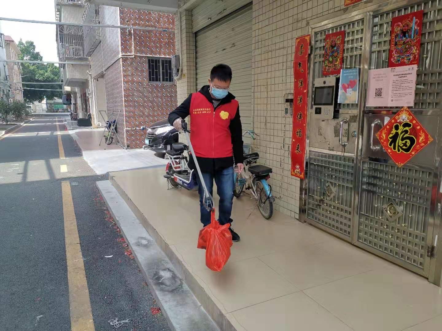 社區(qū)黨委副書記黃幼專同志帶頭為居民隔離人員消毒垃圾并處理垃圾