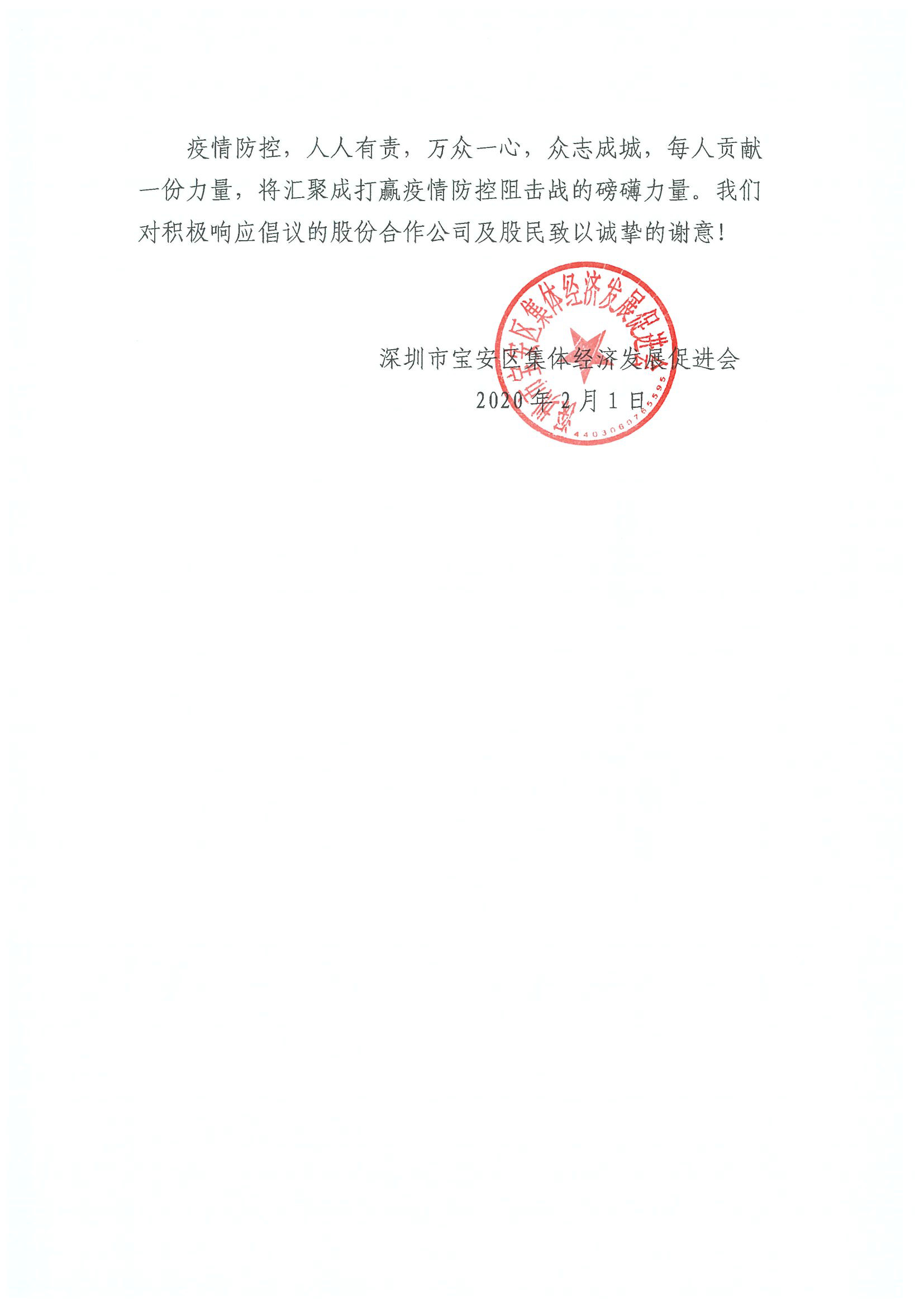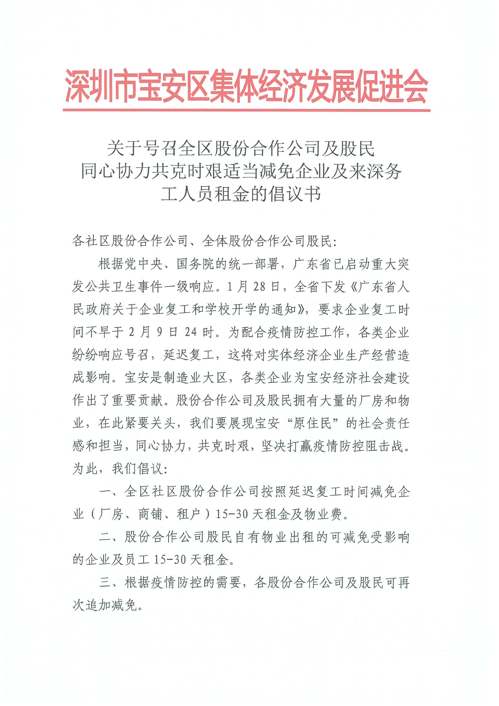 深圳新聞網(wǎng)寶安訊 “疫情防控,人人有責(zé),萬(wàn)眾一心,眾志成城,每人貢獻(xiàn)一份力量,將匯聚成打贏疫情防控阻擊戰(zhàn)的磅礴力量。”2月1日晚,寶安區(qū)集體資產(chǎn)管理局指導(dǎo)寶安區(qū)集體經(jīng)濟(jì)發(fā)展促進(jìn)會(huì)向?qū)毎矃^(qū)各社區(qū)股份合作公司、全體股份合作公司股民發(fā)出《同心協(xié)力共克時(shí)艱適當(dāng)減免企業(yè)及來(lái)深務(wù)工人員租金的倡議書(shū)》,號(hào)召全區(qū)股份合作公司及股民適當(dāng)減免企業(yè)及來(lái)深務(wù)工人員15-30天租金及物業(yè)費(fèi),并根據(jù)疫情防控的需要可再次追加減免。