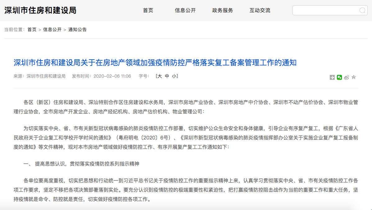 見圳客戶端·深圳新聞網(wǎng)2020年2月6日訊(見圳客戶端、深圳新聞網(wǎng)記者 潘潤華 通訊員 雷湘君)2月6日,深圳市住建局在其官網(wǎng)發(fā)布通知指出,在全省啟動(dòng)重大突發(fā)公共衛(wèi)生事件一級(jí)響應(yīng)期間,暫停房地產(chǎn)項(xiàng)目現(xiàn)場開盤活動(dòng),暫停房地產(chǎn)中介線下帶看房活動(dòng)(企業(yè)自持物業(yè)出租除外),暫停疫情重點(diǎn)地區(qū)現(xiàn)場評(píng)估業(yè)務(wù)活動(dòng)。此外,各物業(yè)管理公司應(yīng)加強(qiáng)人員管理,暫停經(jīng)紀(jì)人員帶客進(jìn)入小區(qū)看房活動(dòng)。具體恢復(fù)時(shí)間另行通知。