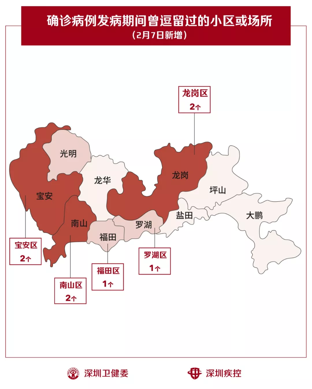 2月7日,疾控專業(yè)人員通過最新的流行病學(xué)調(diào)查確認,深圳新增8個小區(qū)(場所),有新確診的病人在出現(xiàn)病征期間曾經(jīng)逗留。