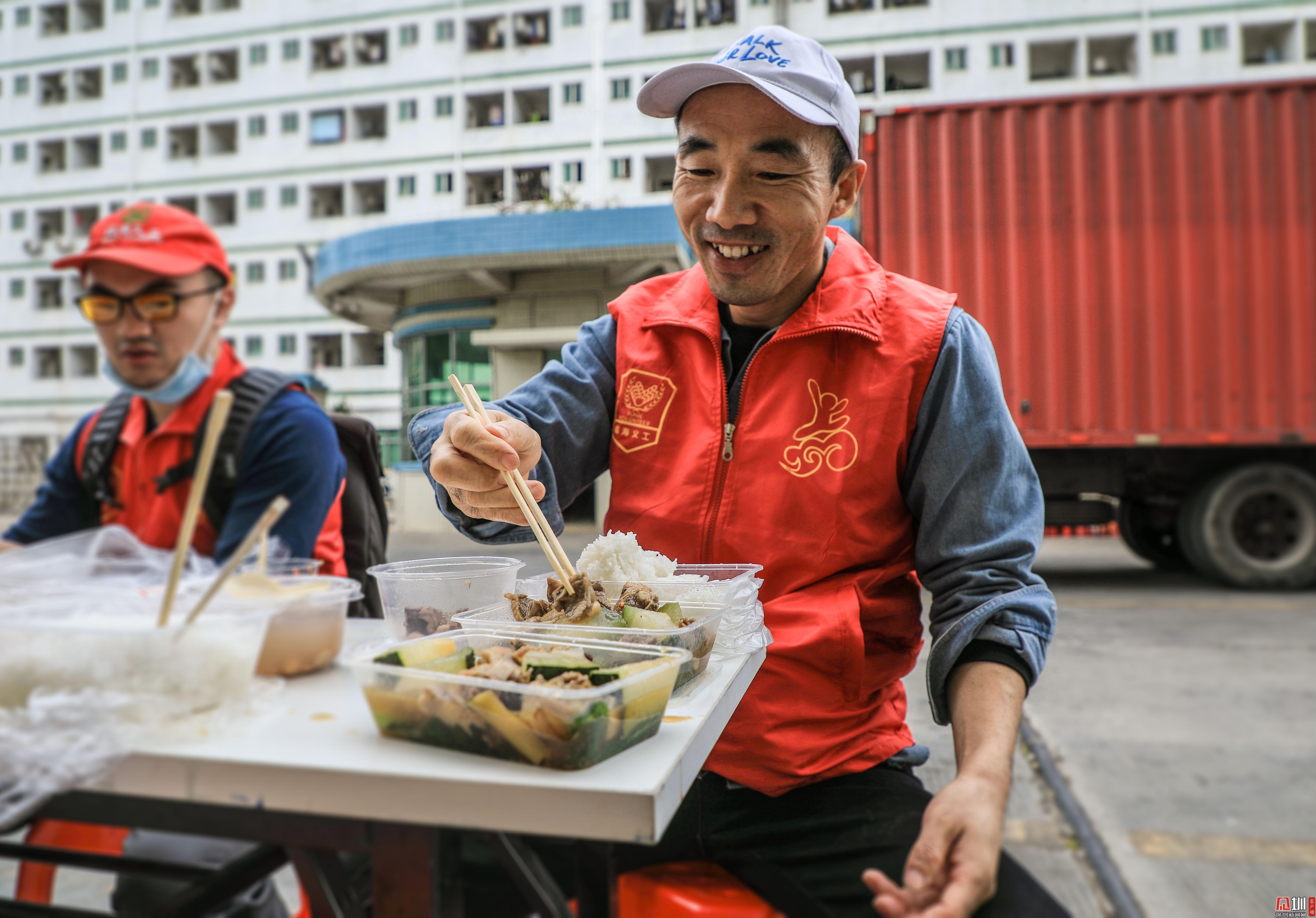 擺好桌子后,郭建庚便去排隊為義工們領(lǐng)來午餐,在工廠門口負責(zé)幫忙招工的兩位義工不能離崗,郭建庚便把午餐另外給他們送了過去。