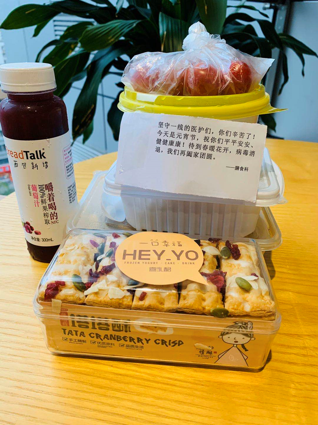 當(dāng)天中午和晚上,發(fā)熱門診、感染科、隔離病房、檢驗(yàn)科等一線的醫(yī)護(hù)人員,除了收到可口的飯菜外,還收到了一碗熱氣騰騰的湯圓。讓他們意外的是,湯圓盒上還貼了溫馨的字條,“堅(jiān)守一線的醫(yī)護(hù)們,你們辛苦了!今天是元宵節(jié),祝你們平平安安、健健康康!待到春暖花開,疫情消退,我們再闔家團(tuán)圓?!?/p>