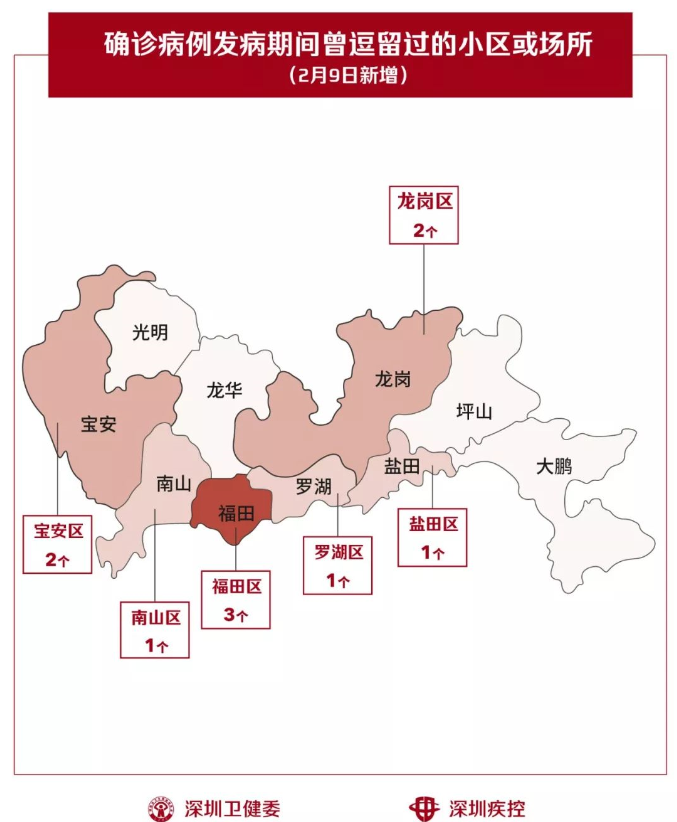 2月9日,疾控專業(yè)人員通過最新的流行病學(xué)調(diào)查確認(rèn),深圳新增10個(gè)小區(qū)(場(chǎng)所),有新確診的病人在出現(xiàn)病征期間曾經(jīng)逗留。