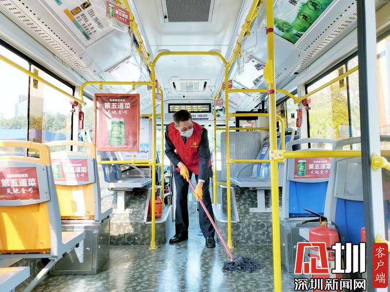 深圳巴士集團(tuán)四分公司工作人員對(duì)公交車進(jìn)行消毒擦洗。