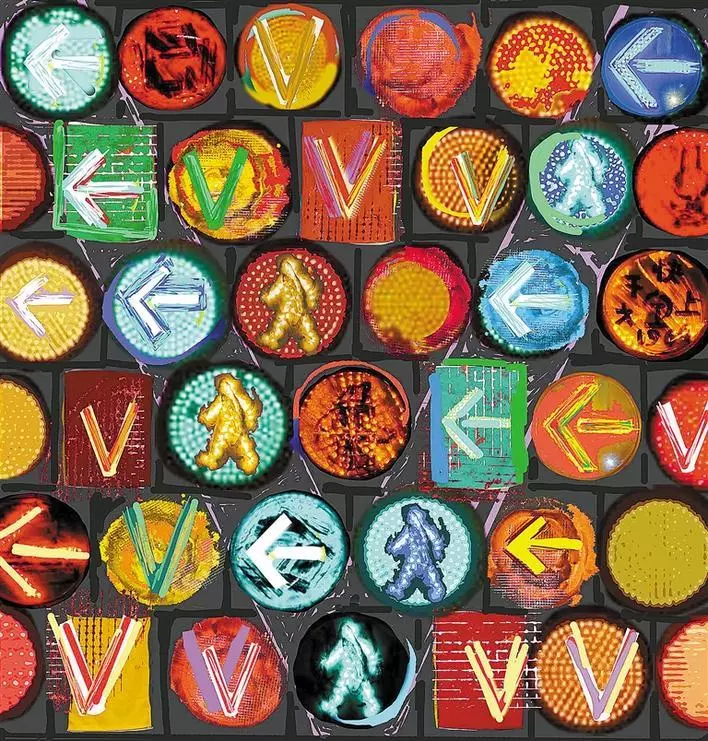 梁宇透露,這件作品的創(chuàng)作四易其稿,將信號(hào)燈所指代的“社會(huì)規(guī)則”加以排列強(qiáng)化,以此強(qiáng)調(diào)“秩序”本身在與疾病博弈混亂環(huán)境中的重要性。作品以濃烈的對(duì)比色彩、緊密排列的幾何圖形試圖傳達(dá)當(dāng)下人們的緊張情緒和焦慮心態(tài)。同時(shí),信號(hào)燈中“行走”、“前進(jìn)”、“Victory”的提示標(biāo)識(shí),被清晰地提煉出來,成為能讓畫面安定的因素,望帶給觀者一點(diǎn)思緒的寧靜與心靈的慰藉。