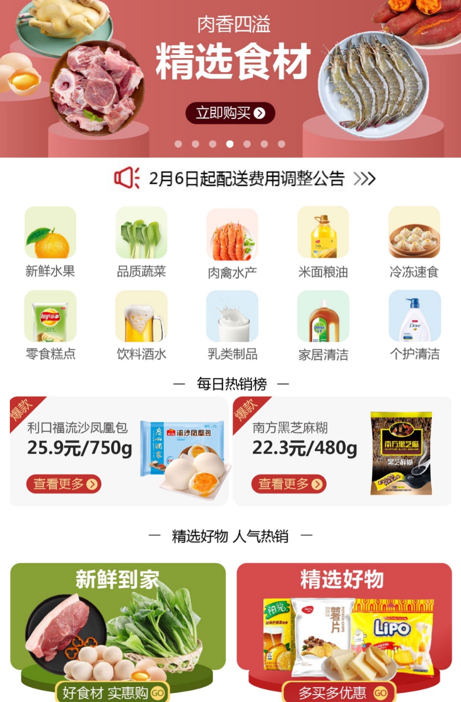 商品情況:除了生鮮日用品,母嬰用品、廚具電器都有。但春節(jié)需求旺盛,需提前搶購(gòu),可先看看自己所在地區(qū)是否提供配送。