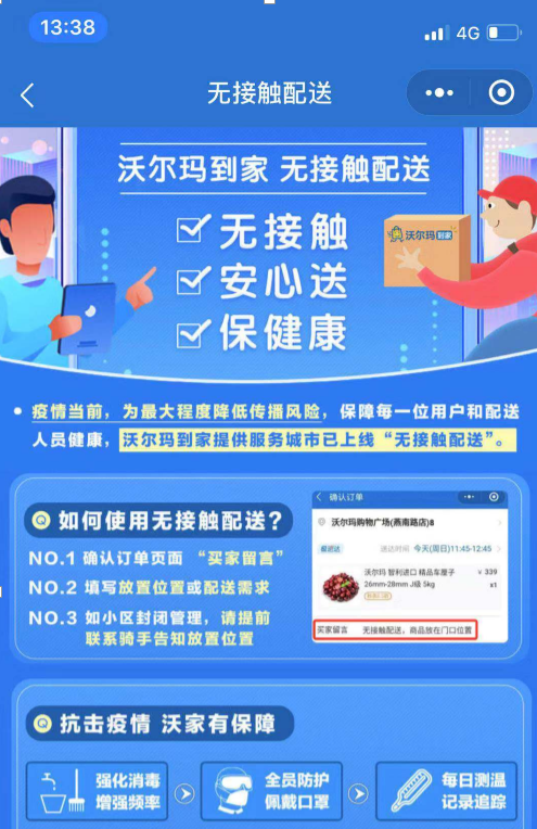 1、下單時(shí)備注選擇“無(wú)接觸配送服務(wù)”,盡量避免面對(duì)面接觸。