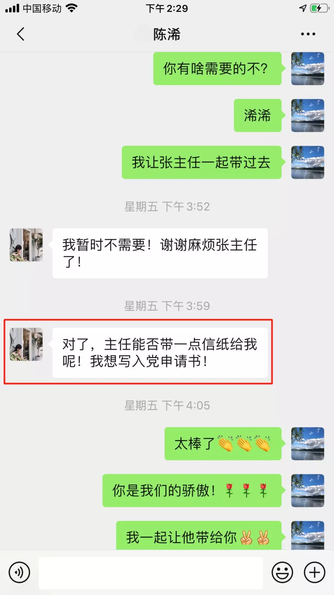 “主任能否帶一點(diǎn)信紙給我呢!我想寫入黨申請(qǐng)書!”陳浠在戰(zhàn)疫一線向組織發(fā)出了入黨申請(qǐng)!