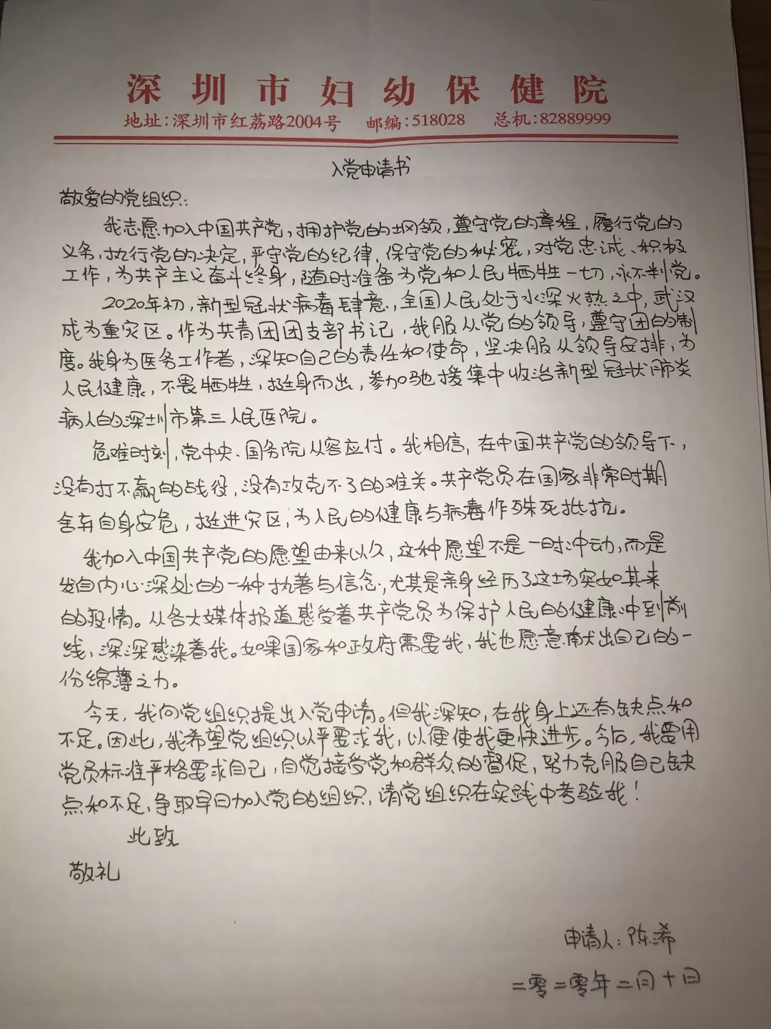2月10日,陳浠在戰(zhàn)“疫”一線向組織提交了入黨申請書,她表示要以實(shí)際行動向身邊的共產(chǎn)黨員學(xué)習(xí),希望早日加入黨組織,在抗擊疫情的一線,在今后的每一天,充分發(fā)揮黨員的先鋒模范作用。