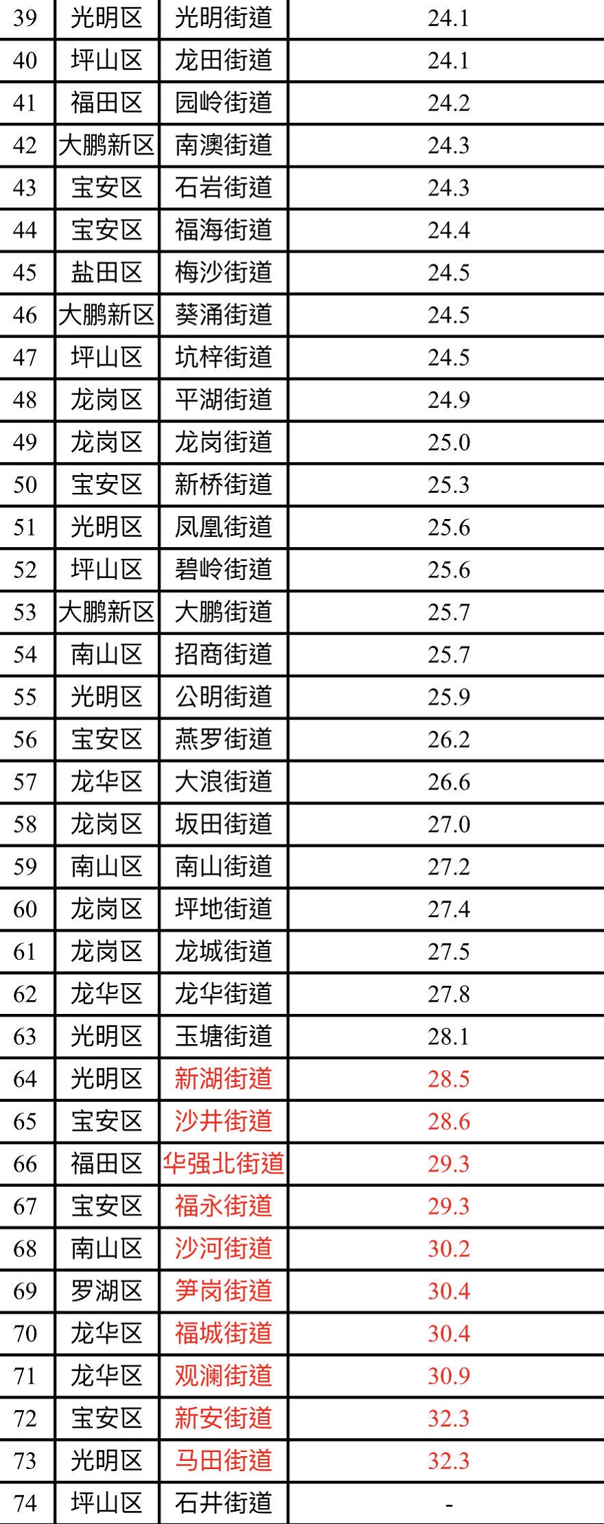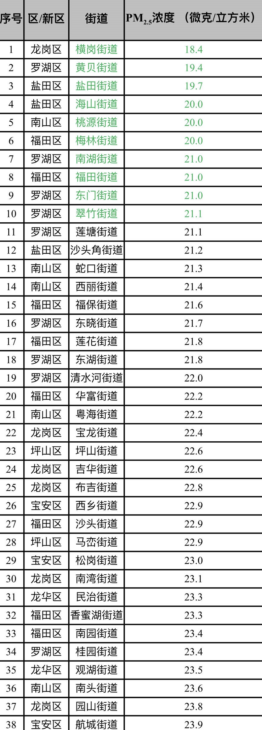 見圳客戶端·深圳新聞網(wǎng)2020年2月12日訊(見圳客戶端、深圳新聞網(wǎng)記者 陳婕)2020年1月,深圳市74個街道PM2.5濃度在18.4-32.3微克/立方米之間,均值為24.3微克/立方米。排名前十的是:橫崗、黃貝、鹽田、海山、桃源、梅林、南湖、福田、東門和翠竹等街道,排名倒數(shù)前十的是:馬田、新安、觀瀾、福城、筍崗、沙河、福永、華強(qiáng)北、沙井和新湖等街道。
