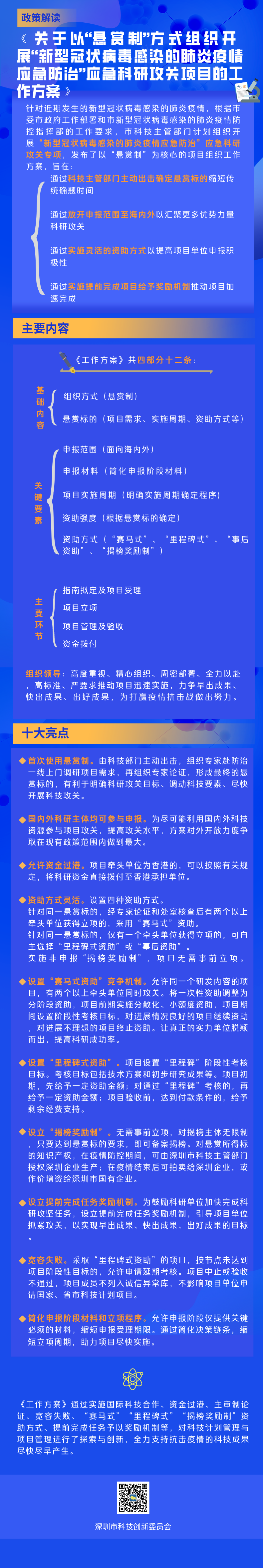 據(jù)悉,該方案首次使用懸賞制,由科技部門(mén)主動(dòng)出擊,組織專(zhuān)家赴防治一線(xiàn)上門(mén)調(diào)研項(xiàng)目需求,再組織專(zhuān)家論證,形成最終懸賞標(biāo)的。深圳市科創(chuàng)委相關(guān)負(fù)責(zé)人表示,以“懸賞”為方案核心有利于明確科研攻關(guān)目標(biāo)、調(diào)動(dòng)科技要素、盡快開(kāi)展科技攻關(guān)。此外,為盡可能利用國(guó)內(nèi)外科技資源參與項(xiàng)目攻關(guān),提高攻關(guān)水平,方案對(duì)外開(kāi)放力度爭(zhēng)取在現(xiàn)有政策范圍內(nèi)做到最大,國(guó)內(nèi)外科研主體均可參與申報(bào)。
