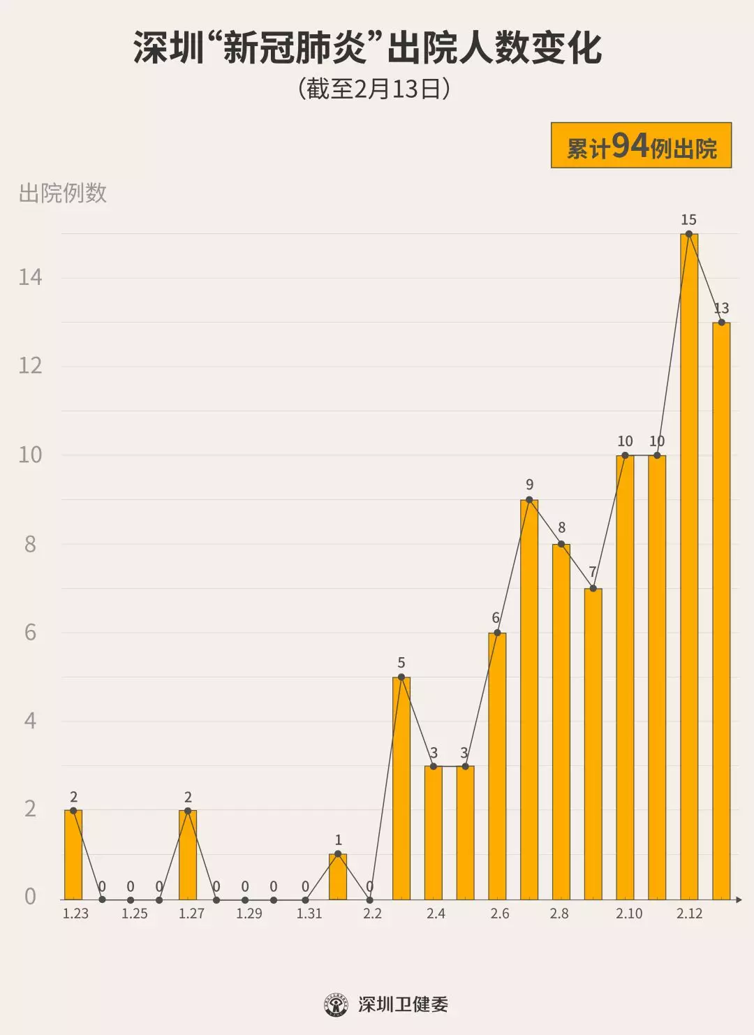2月13日下午,經(jīng)專家組會(huì)診,深圳再有13名新型冠狀病毒肺炎確診患者出院,累計(jì)達(dá)94人。